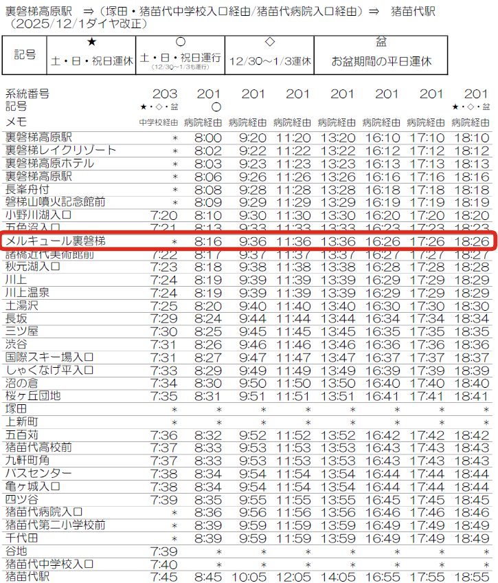 ▼喜多方站⇒里磐梯美居温泉度假酒店之间的时刻表