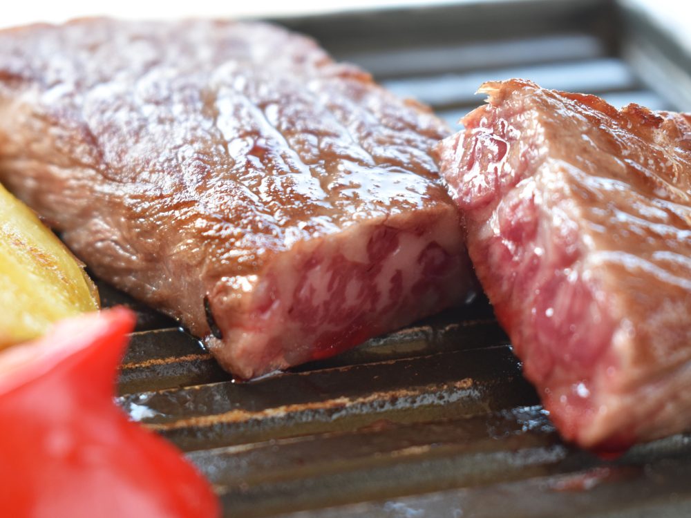 请用特制调味汁享用厨师在眼前烤制的牛排。