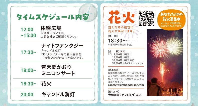 자세한 것은 우라반다이 눈 축제 실행 위원회 사무국(우라반다이 관광 협회) 0241-32-2349까지
